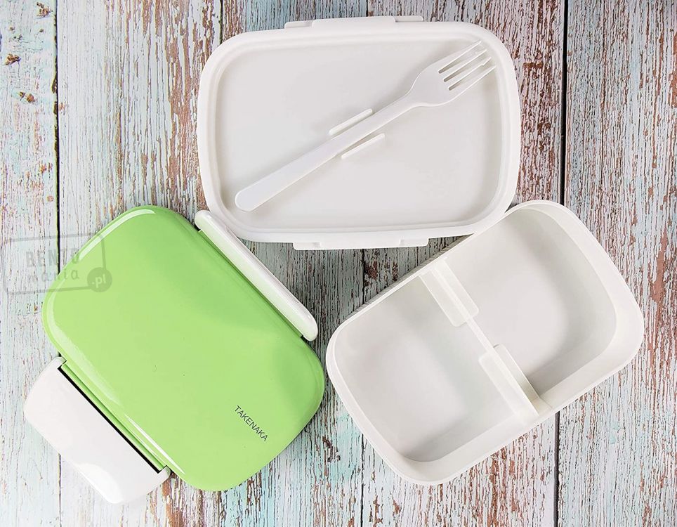 Nowoczesny, oryginalny, japoński bentobox wraz z widelcem i przenośną/wyjmowaną przegródką w zestawie (która umożliwia oddzielenie od siebie różnych rodzajów żywności w lunch boxie).