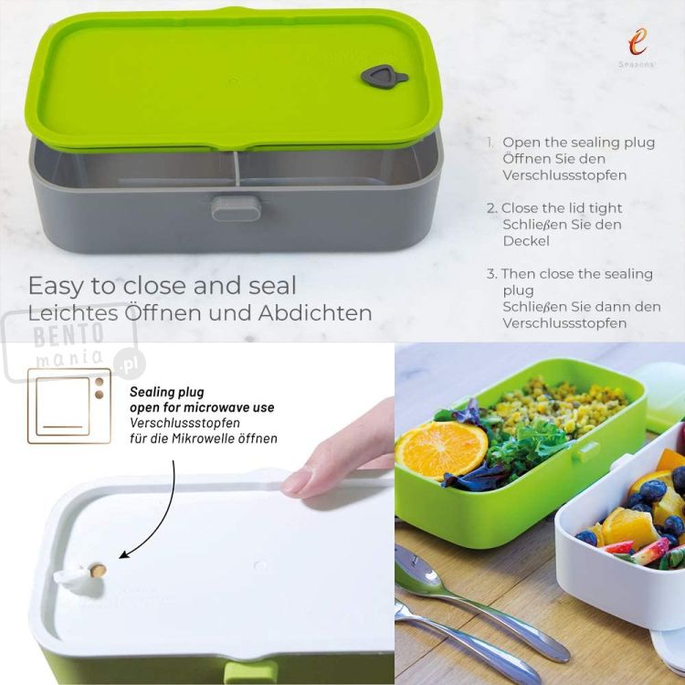 Można go używać w kuchence mikrofalowej (bez zewnętrznej pokrywki i sztućców) po otwarciu silikonowej zatyczki.