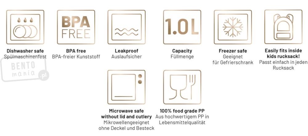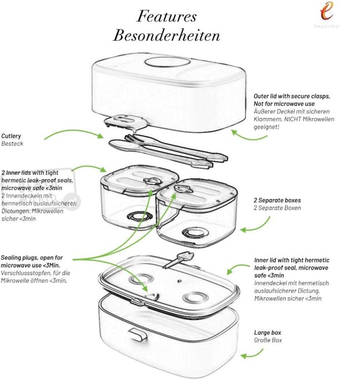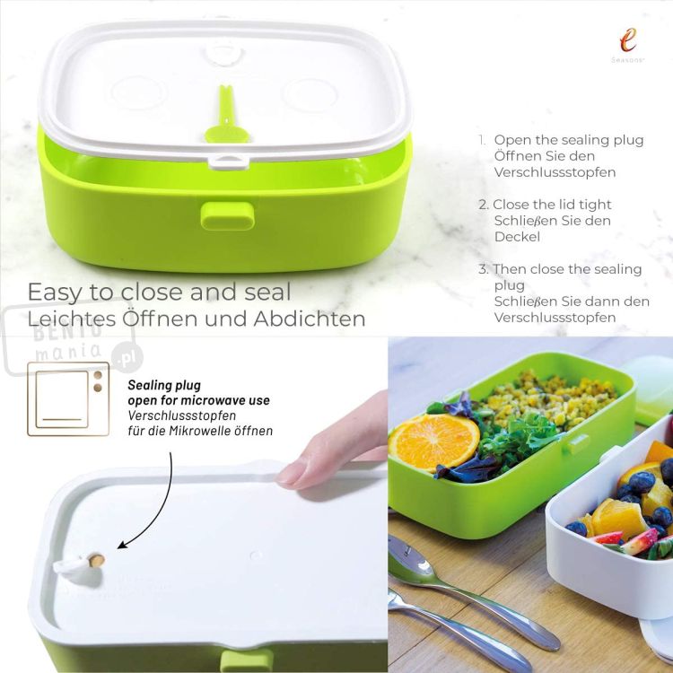 Sztućce w zestawie: Widelec i łyżka bezpiecznie trzymane w górnej pokrywie (dzięki czemu są czyste i oddzielone od jedzenia)