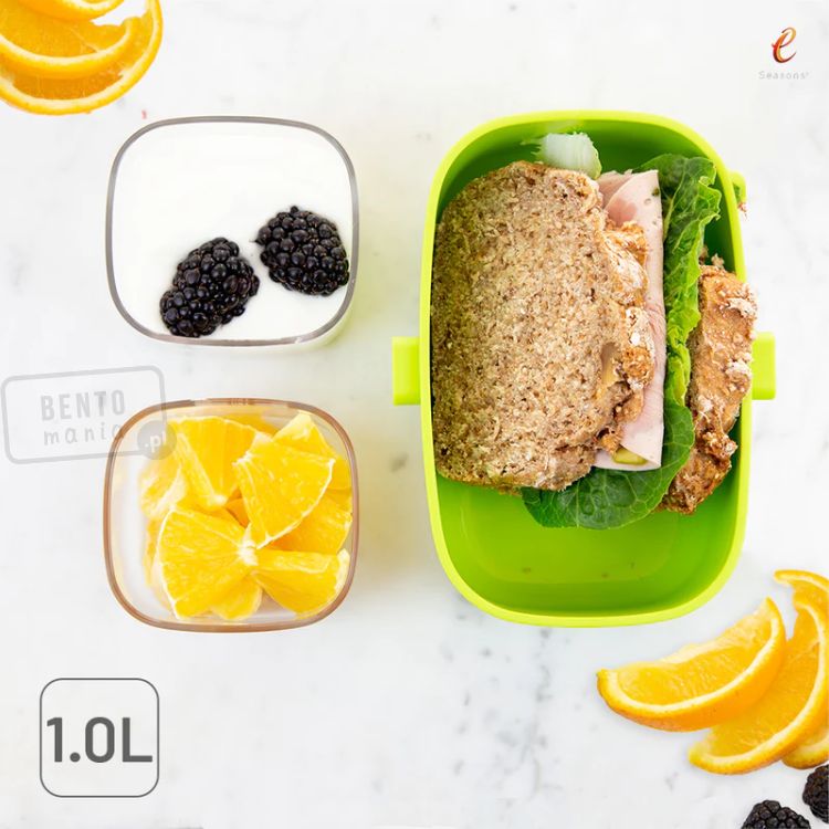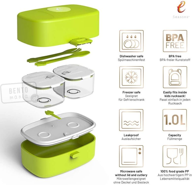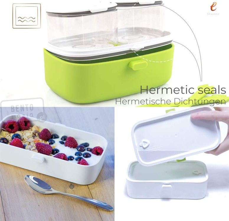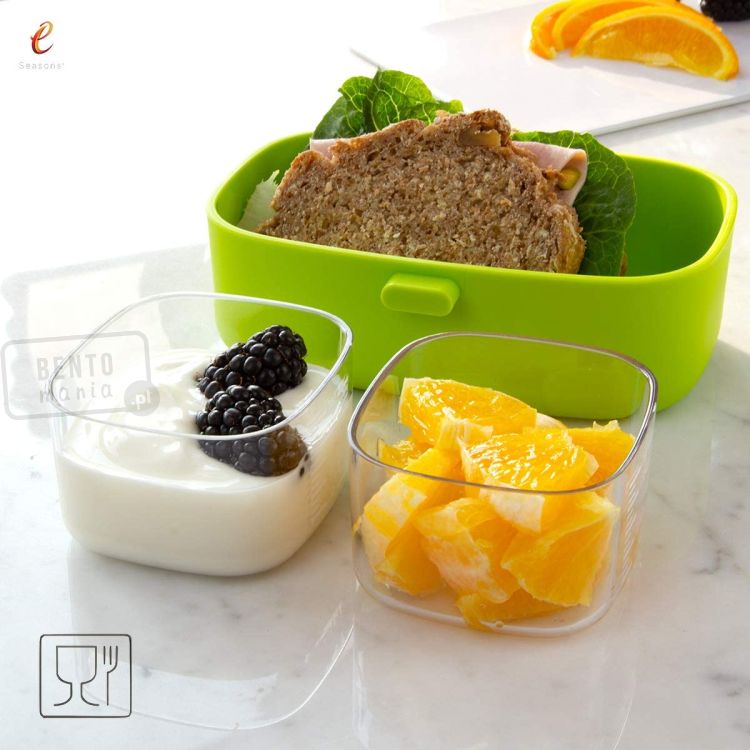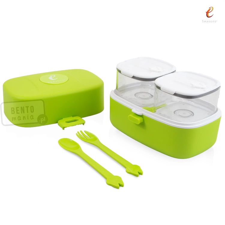 Dwupoziomowy szczelny lunchbox ze sztućcami i dwoma pojemniczkami w zestawie - Eseasons Green White 1 litr
