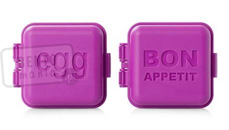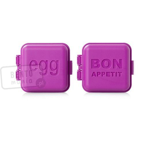 Foremki do jajek firmy Monbento w kolorze fioletowym, które pozwalają zmienić kształt jajek na kwadratowy oraz dodać napis "EGG" oraz "BON Apetit".