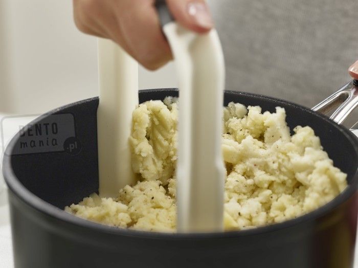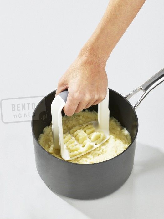 - ułatwia tłuczenie ziemniaków – nacisk i zagarnianie warzyw z brzegów dna oraz ścianek,