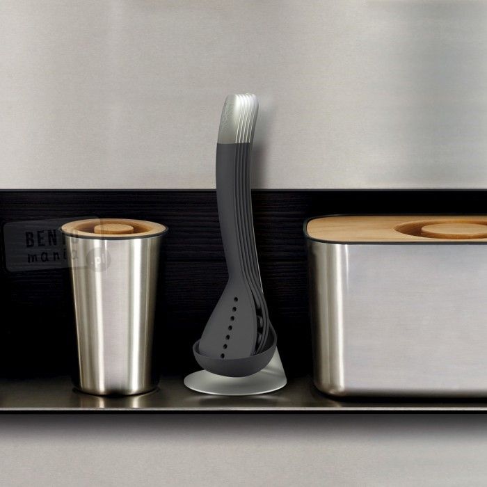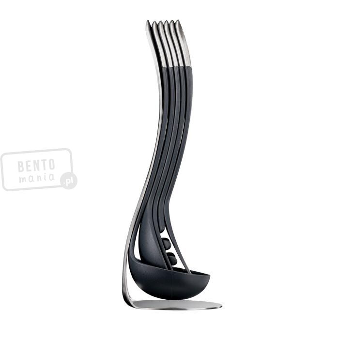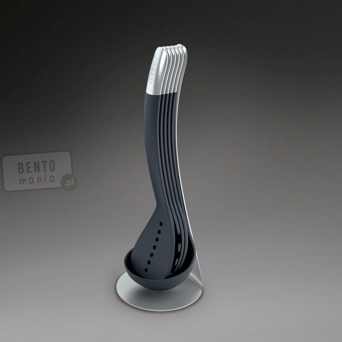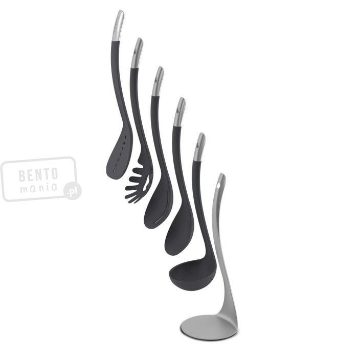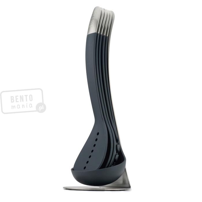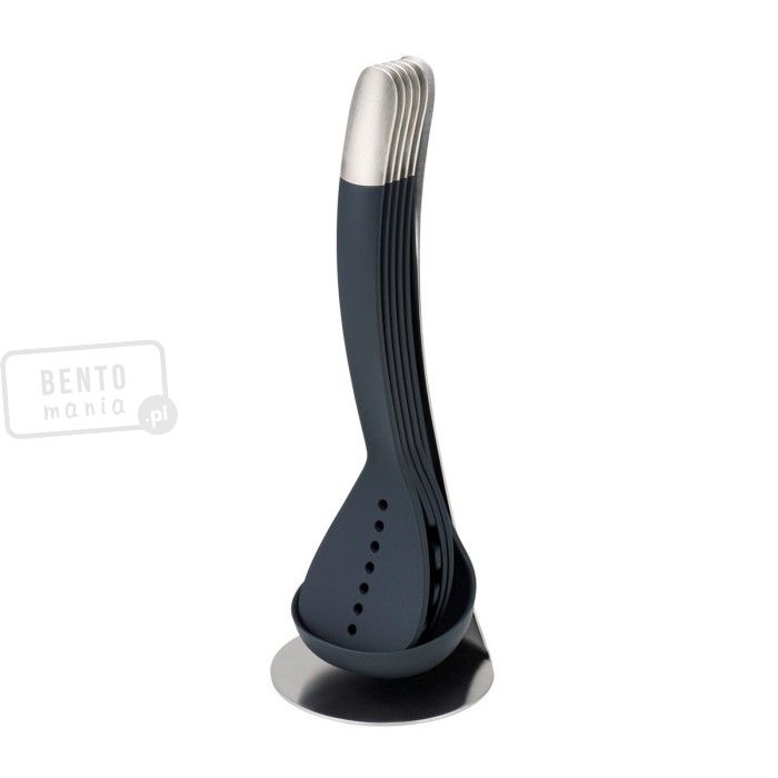 - zestaw narzędzi kuchennych składa się ze stojaka, chochelki, łyżki do mieszania, łyżki cedzakowej, łyżki do spaghetti i łopatki do przewracania,- kompaktowe wymiary - możliwość włożenia jednego narzędzia w drugie,- rączki łączą się ze sobą za pomocą magnesów,- narzędzia umieszczone na stojaku,- materiały: narzędzia - nylon odporny na temperatury do 200°C, zakończenia rączek z matowej stali nierdzewnej 18/8, stojak - stal nierdzewna 18/8, posiada antypoślizgowe nóżki,- narzędzia można myć w zmywarce, stojak czyścić wilgotną ściereczką.Wymiary: 11,8x10,5x33 cm (stojak: szer.xgł. podst.xwys.), długość narzedzi: 32 cm Materiał: nylon, stal nierdzewnaKolor: czarny, srebrnyKolekcja: 100 Collection
