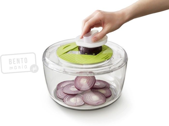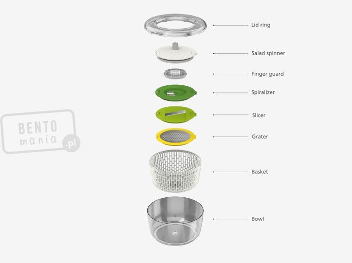 - składa się z miski, durszlaka, 3 wkładek, osłony na palce, mechanizmu wirówki z korbką oraz pierścienia zamykającego,