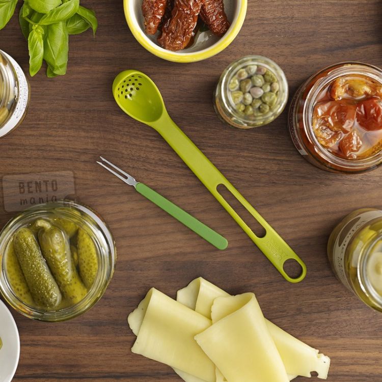 Łyżeczka z widelczykiem idealna do wyciągania produktów ze słoika. Łyżka posiada otworki dzięki czemu sprawdzi się w trakcie wyjmowania oliwek czy pieczarek z zalewy. Dodatkowo w łyżeczce z tyłu znajduje się wyjmowany widelczyk np. do nabijanie ogórków przy wyciąganiu ze słoika.