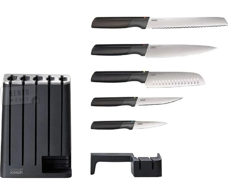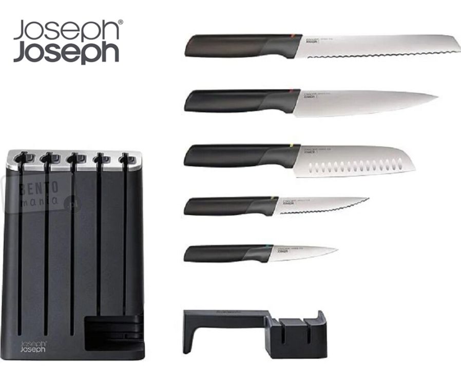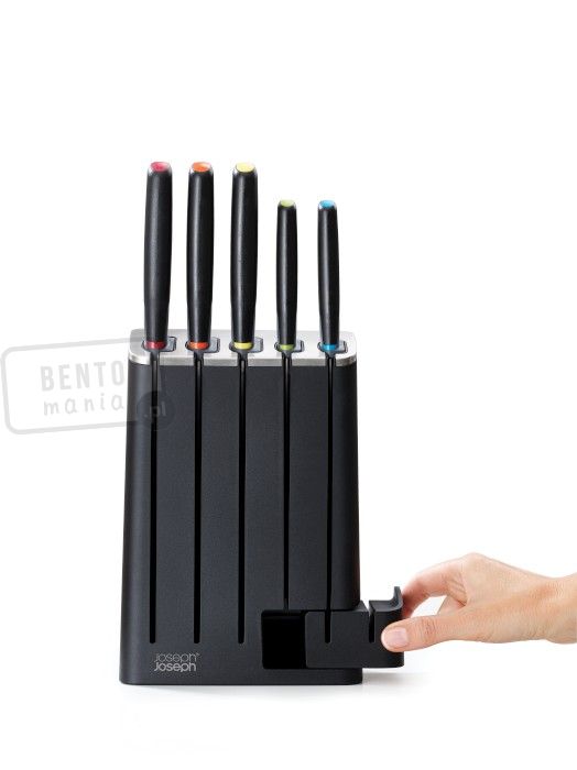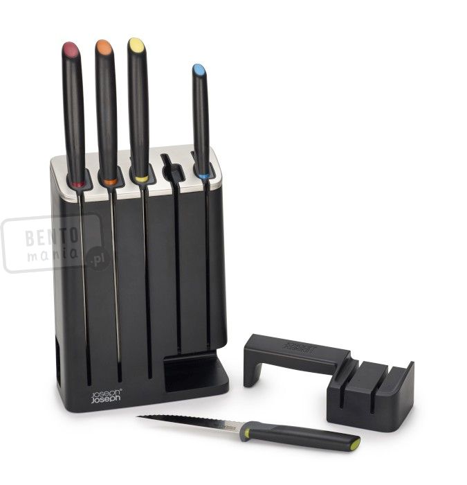 Joseph Joseph zestaw 5 noży z japońskiej stali nierdzewnej w wąskim ergonomicznym bloku z ostrzałką. Zestaw wyróżnia się znakomitą, nowoczesną stylistyką oraz eleganckim wykończeniem.