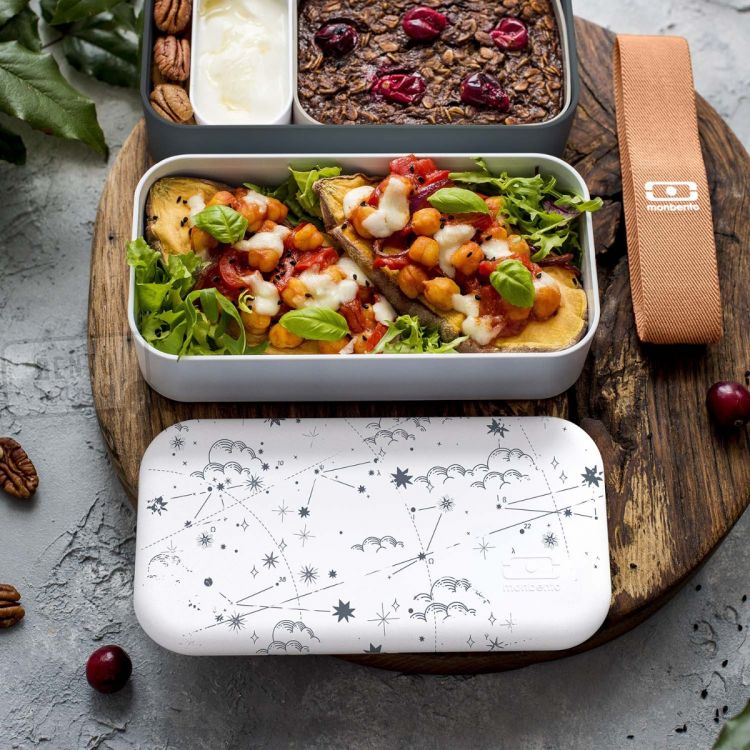 Monbento Original Constellation Zero Waste (lunchbox + torebka furoshiki) to dwupoziomowy, szczelny lunch box zaprojektowany i wyprodukowany we Francji z materiałów przyjaznych dla człowieka i środowiska (nie zawiera BPA i innych szkodliwych substancji). Bento boxy firmy Monbento są stylowe, eleganckie a przy tym trwałe i praktyczne. Świetnie nadają się do przechowywania posiłków zgodnie z filozofią bento, czyli różnorodnych, estetycznie wyglądających i możliwych do spożycia w dowolnym miejscu.