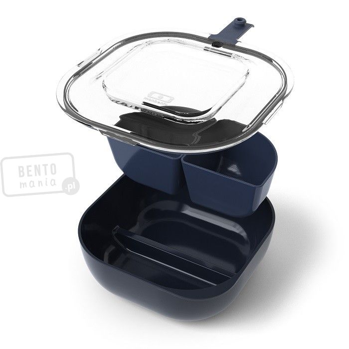 - lunchbox składa się z granatowego pojemnika głównego, 2 pojemników na przekąski oraz przezroczystej pokrywy głównej wyposażonej w uszczelkę,