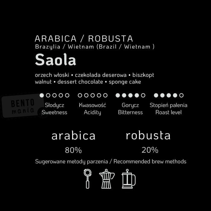 Saola Morten & Larsen to mieszanka kaw arabica (80%) oraz robusta (20%) pochodzących z upraw we wspomnianych regionach.