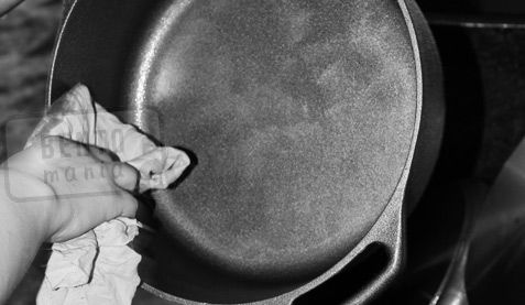 Aby to zrobić nalej niewielką ilość oleju rzepakowego do suchego naczynia, a następnie rozgrzej patelnię do wysokiej temperatury. Pamiętaj, aby naczyń z drewnianą rączką nie ogrzewać w piekarniku/piecu! Po około 10-15 minutach usuń nadmiar oleju. Naczynie powinno mieć kolor czarny co oznacza, że jest ponownie gotowe do użycia.
