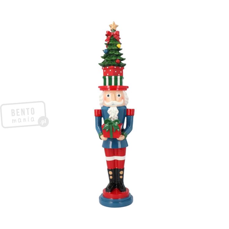 Dekoracyjna figura świąteczna - Dziadek do orzechów z choinką na czapce i trzymający prezent.