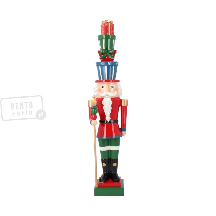 Dekoracyjna figura świąteczna przedstawiająca Dziadka do orzechów z kolorowymi prezentami na czapce.