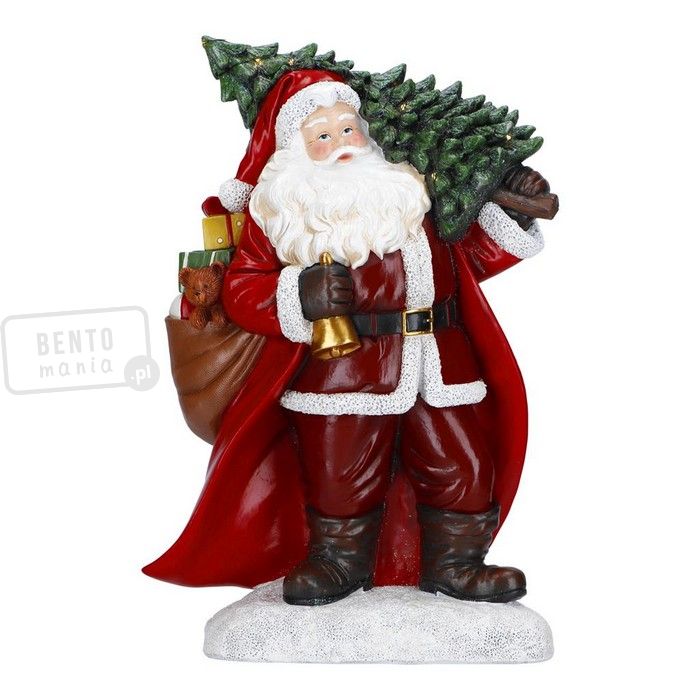 Świąteczna, dekoracyjna figurka przedstawiająca Św. Mikołaja z workiem prezentów niosącego choinkę.