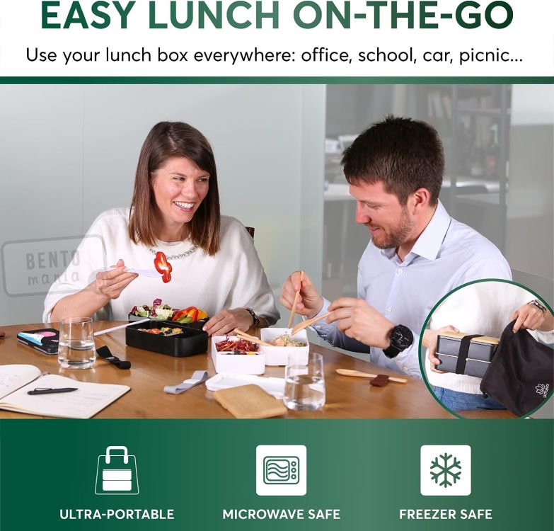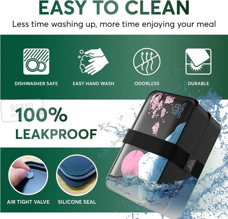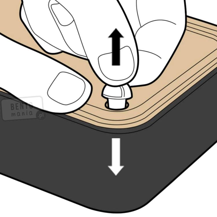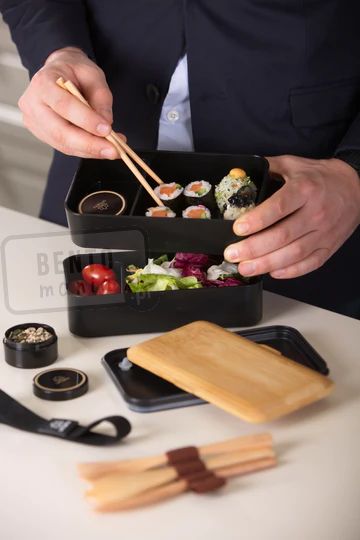 Bento box składa się z dwóch bardzo szczelnych pojemników, ustawianych jeden na drugim. Pojemniki pozostaną w stabilnej pozycji dzięki specjalnej elastycznej gumce. Lunch box można przechowywać w lodówce lub zamrażarce, można myć w zmywarce i można podgrzewać w kuchence mikrofalowej - są więc bardzo praktyczne, a przy tym eleganckie.