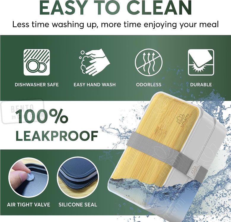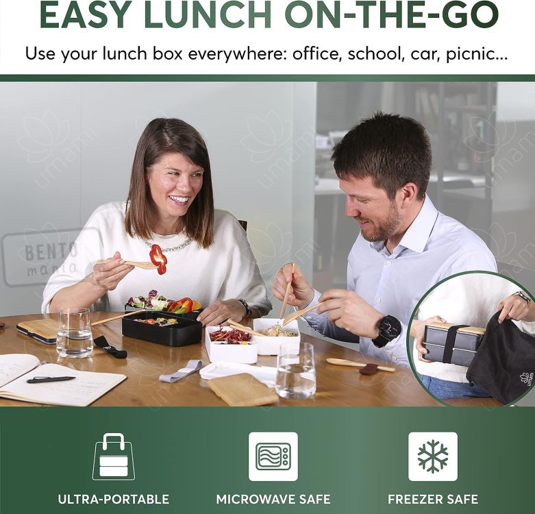 Umami to dwupoziomowy, szczelny bento lunch box ze sztućcami (i pałeczkami), dwoma przegródkami i dwoma pojemniczkami w zestawie. Zaprojektowany we Francji z materiałów przyjaznych dla człowieka i środowiska (nie zawiera BPA i innych szkodliwych substancji).