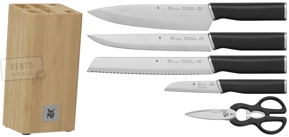 Zestaw zaawiera : 1x blok na noże, 1x nóż szefa kuchni 20 cm , 1x nóż do mięsa 20 cm , 1x nóż do chleba 20 cm , 1x nóż do warzyw 9 cm , 1x nożyczki