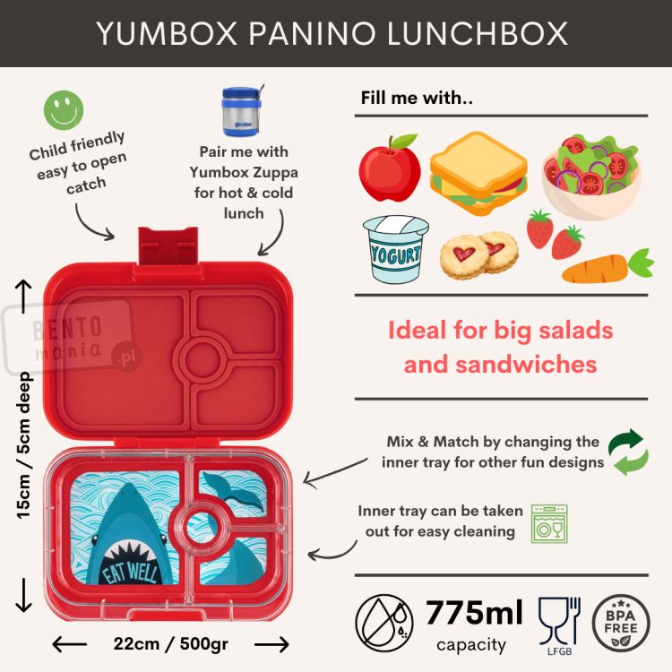- wymiary takie jak Yumbox Classic (różnią się jedynie liczbą przegródek: Classic ma 6 przegródek, a Panino ma 4 przegródki)
