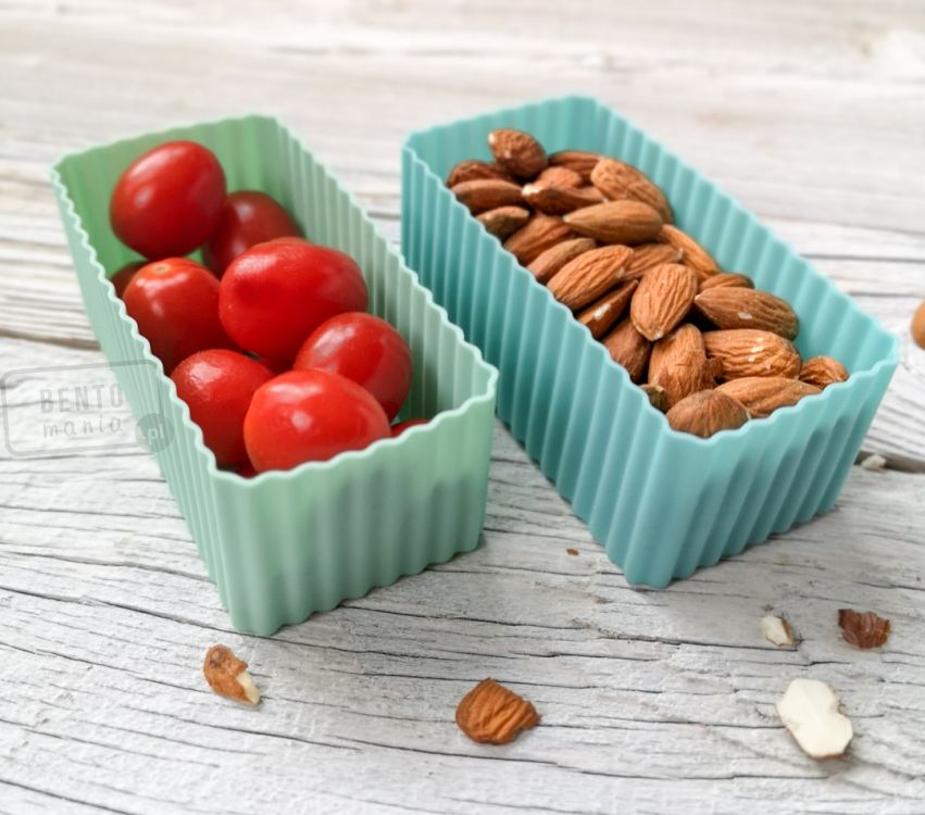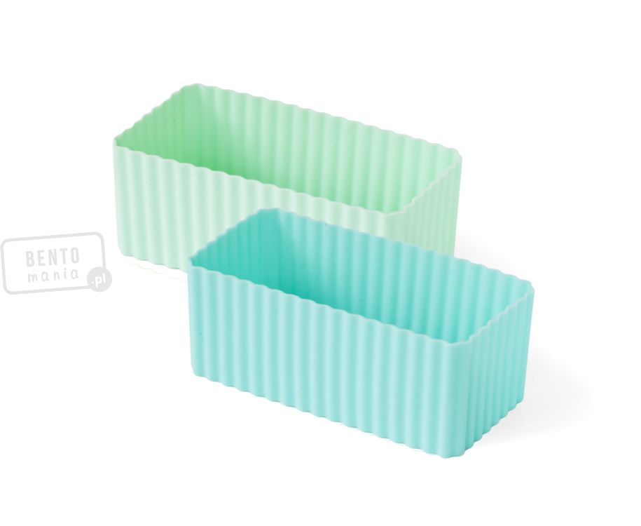 Zestaw 2 silikonowych pojemniczków na sosy i dodatki. Pojemniczki o prostokątnym kształcie, pasują do lunchboxów firmy Yumbox, Littlelunchbox, Monbento (i innych lunchboxów o podobnych wymiarach).
