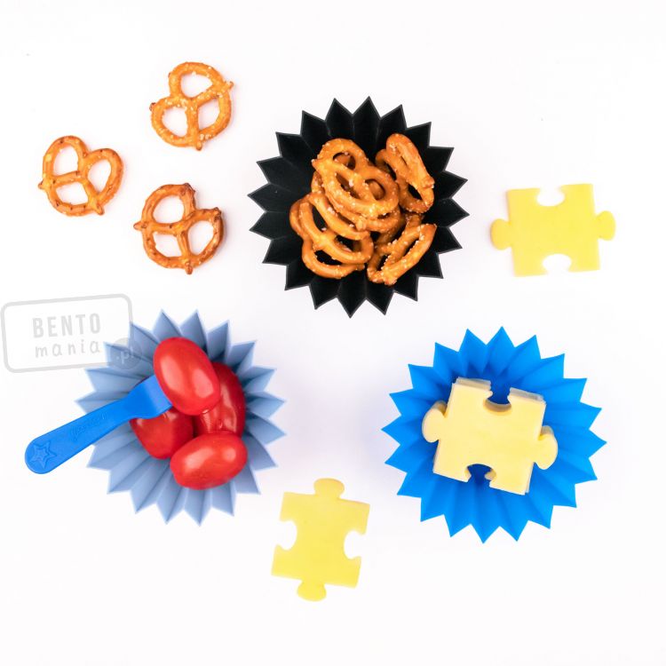 Zestaw 3 silikonowych pojemniczków na sosy i dodatki. Pojemniczki o okrągłym kształcie, pasują do lunchboxów firmy Yumbox (i innych lunchboxów o podobnych wymiarach).