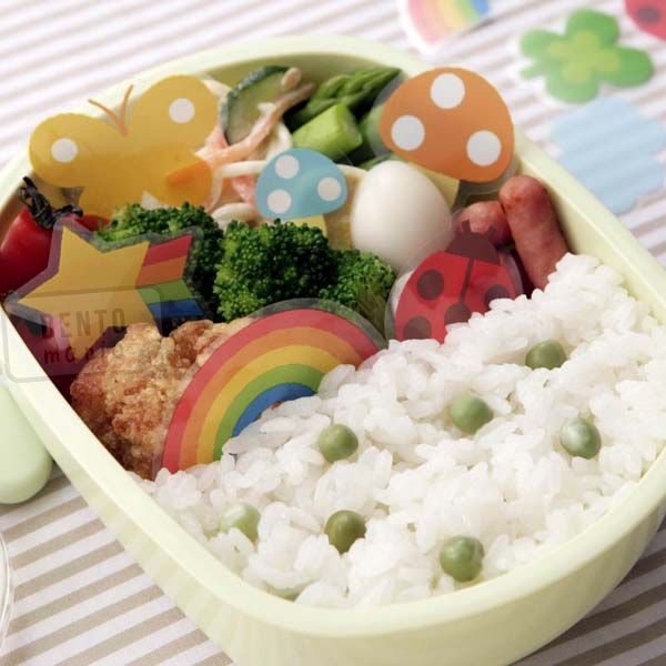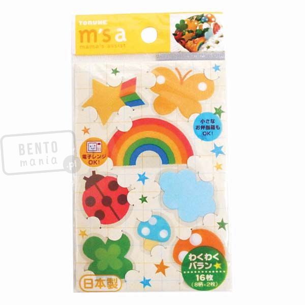 - zestaw do ozdabiania bento, 16 przekładek: tęcza, biedronka, koniczynka, gwiazdka, grzybki, motylek, chmurka (wszystkie po 2 sztuki)