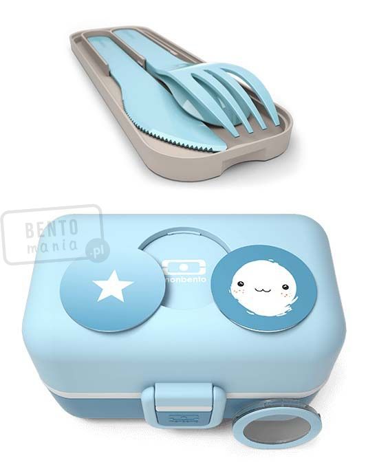 Zestaw niebieski: lunchbox Monbento Tresor + plastikowe sztućce