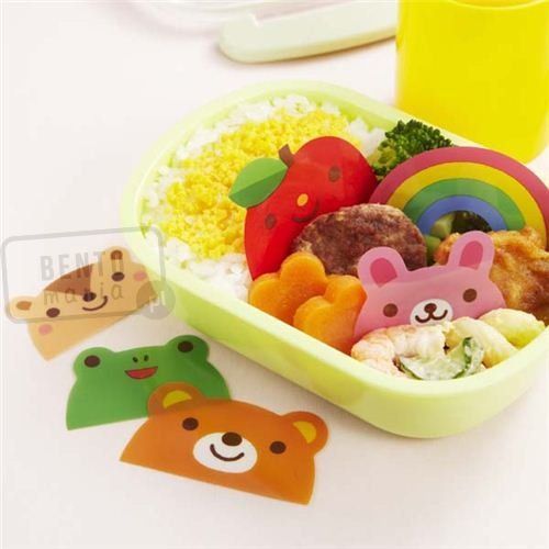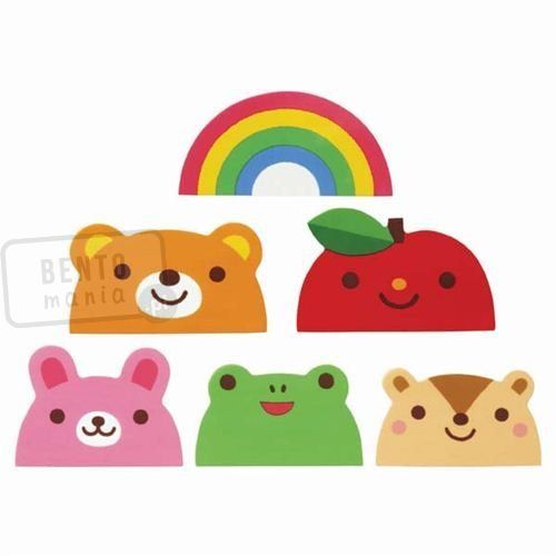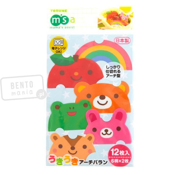 - zestaw 12 przekładek (6 rodzajów - zwierzaki, jabłko i tęcza), które umożliwiają oddzielenie bento i zapobiegają mieszaniu się żywności w lunchboxie